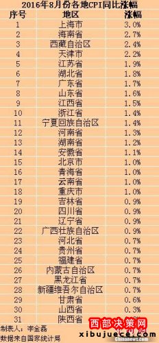 在31個省份中,上海8月份CPI漲幅全國最高,為3.0%,漲幅比7月回落0.4個百分點。數(shù)據(jù)顯示,上海CPI漲幅自今年3月份開始已連續(xù)6個月處于“3時代”。陜西和山西8月份CPI漲幅僅為0.3%,為全國最低。