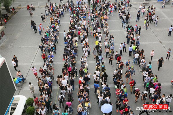 除了游5外,西安火車站廣場(chǎng)發(fā)往華清池、兵馬俑的914路、915路公交車也被游客擠爆。(記者魏永賢)