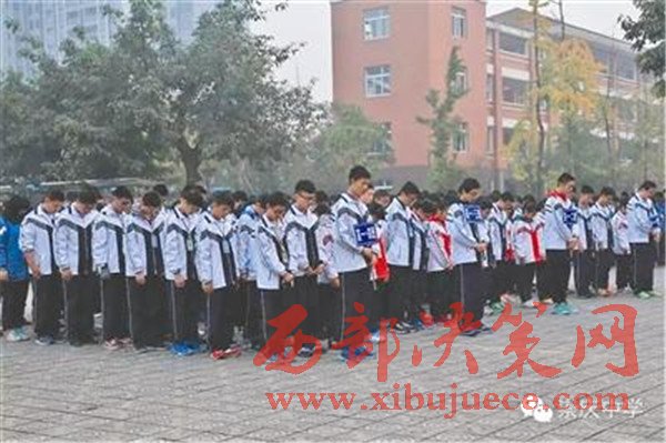 在晨霧中,崇慶中學(xué)的師生們?yōu)橛嘈衲?,三分鐘后,同學(xué)們走向敬賢樓,向余旭的遺像獻(xiàn)花。在一米多高的照片中,余旭一身戎裝,神采飛揚(yáng)。