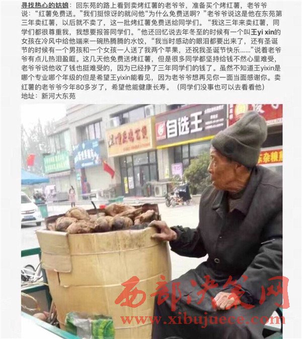 說起這位賣紅薯的老爺爺,河南大學(xué)的學(xué)生們印象都十分深刻,紛紛道出了自己和賣紅薯老爺爺之間的暖心事。