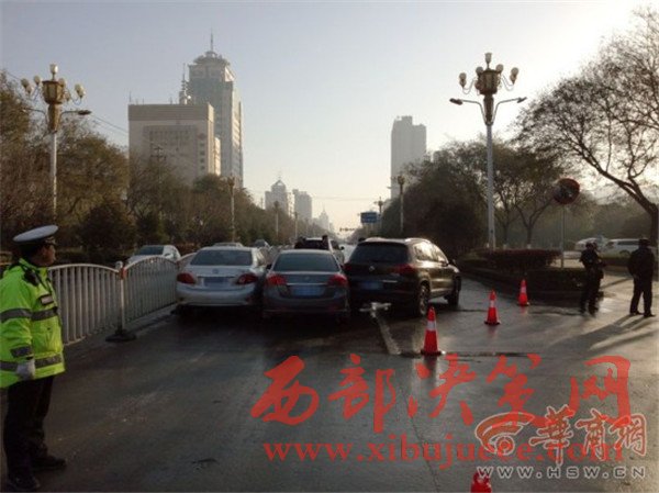 12月6日上午8時許,在渭南市區(qū)朝陽大街與三賢路丁字以西,約300米長的東向車道十分濕滑,共有16輛車接連發(fā)生交通事故