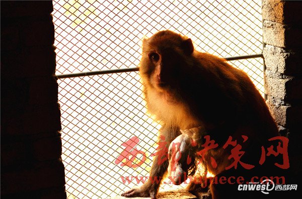 2016年12月8日,左前臂手術(shù)后的獼猴跳到寧強(qiáng)縣野生動物救助中心的窗戶上警惕地看著工作人員。