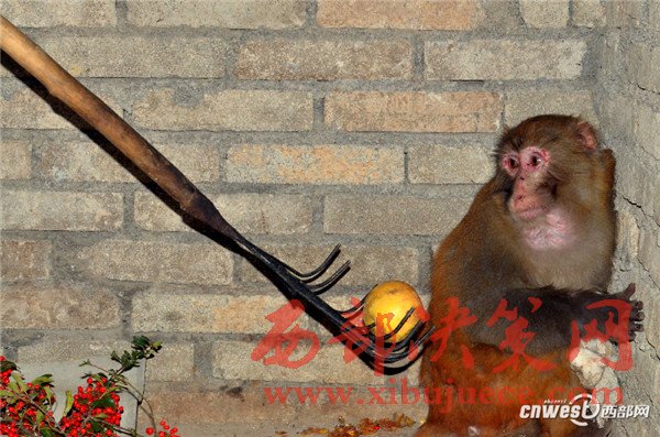 2016年12月8日,在寧強(qiáng)縣野生動植物保護(hù)站的工作人員耐心“勸慰”下,這只獼猴終于轉(zhuǎn)過頭來看著鐵叉上的蘋果。