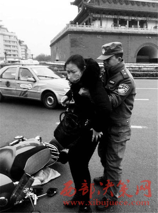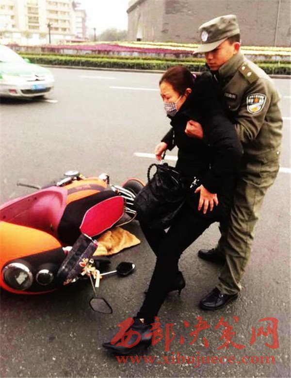 西安一中年女子騎電動(dòng)車被撞 城管攙扶救助