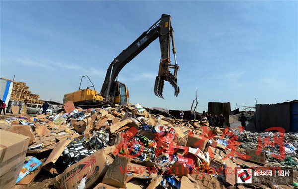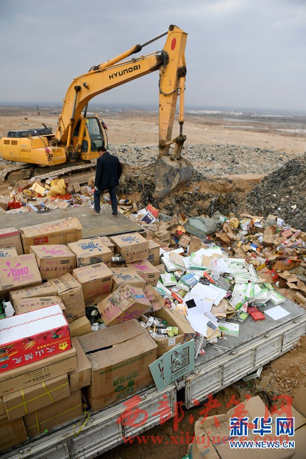 3月14日,在寧夏寧東垃圾填埋場,工作人員將假冒偽劣商品進(jìn)行填埋處理。“3·15”國際消費者權(quán)益日即將到來之際,銀川市市場監(jiān)督管理局集中展示并銷毀食品、藥品、電器等32個類別的假冒偽劣商品。