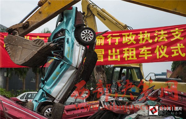 2016年6月16日上午,廣東深圳,深圳市交通運輸行政執(zhí)法支隊在觀瀾大富扣車場舉行公開銷毀假冒出租車儀式,對查扣的484輛假冒出租車依法、公開、集中進(jìn)行銷毀。圖為銷毀現(xiàn)場,假“的士”在挖掘機(jī)的巨臂下變成廢鐵。