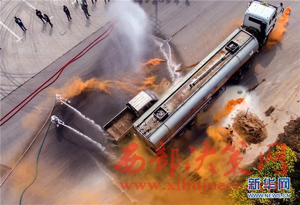 4月6日,參加演練人員對危化品運輸車輛“交通事故”現場進行處置。