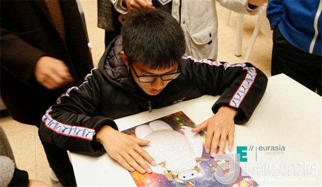 土豆和西紅柿根本就不是一個世界的,但它們走到了一起,變成了薯條和番茄醬它倆就是絕配;學(xué)籍制度和競技運(yùn)動也不是一個世界的,但它們?nèi)诤显诹艘黄?,變成了頭腦風(fēng)暴和趣味運(yùn)動它們也可以很般配,現(xiàn)在就讓我們來看看它們是怎么融合的……聽那陣陣氣球爆炸的聲音,他們開始了!在這些綠油油的氣球中有事先設(shè)置的題目隊員們要先擠爆氣球答完題才能得到下一個地方的線索,“補(bǔ)考成績不合格以及成績低于50分必須怎樣?”“本科選修課學(xué)分不得低于多少學(xué)分?”這些題是不是還要開動腦袋瓜仔仔細(xì)細(xì)的想想才有答案呢?在比賽的現(xiàn)場一秒都會和對手拉開差距,容不得一絲猶豫拿到線索的隊員們又奔向下一個地點熟悉的教室,這里也不是那么容易通過,看著黑板上的題“冰怎么很快的化成水?”“可替代大學(xué)英語四級成績的考試有哪些?”哦,還有計算題,隊員們必須腦洞大開,腦細(xì)胞飛速運(yùn)轉(zhuǎn),做學(xué)霸那也是不容易的。只見黑板上粉筆一起一落,答題完畢,看看線索迅速趕往下一地點——地中海。這里指壓板、跳繩早已準(zhǔn)備好等著隊員們,學(xué)霸不能只管學(xué)習(xí)身體素質(zhì)也很重要,動起來吧!在指壓板上跳繩,誰想出來的?忍受著腳底的疼痛還要揮動跳繩?太受虐,但是我們是一群不屈不撓的新一代,指壓板上跳繩我們也是鏗鏘有力、一絲不茍。終于結(jié)束痛并快樂著的跳繩環(huán)節(jié),卻看到了整整400塊的拼圖,這個環(huán)節(jié)真是讓人又愛又恨,還記得兒時玩拼圖的快樂,但在這激烈的競爭環(huán)境下,卻是讓人有點心慌和畏懼。隊員們最終齊心協(xié)力戰(zhàn)勝了它,細(xì)心、耐心的逐一完好的拼完了每一副圖。