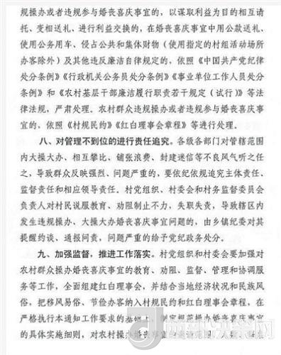 各級各部門對管轄范圍內(nèi)大操大辦、相互攀比、鋪張浪費、封建迷信等不良風氣聽之任之,導致群眾反映強烈、問題嚴重的,要依紀依規(guī)追究主體責任、監(jiān)督責任和相應(yīng)領(lǐng)導責任。村黨組織、村委會和村務(wù)監(jiān)督委員會負責人對村民說服教育、勸阻制止不力,失職失責,導致轄區(qū)內(nèi)發(fā)生違規(guī)操辦、大操大辦婚喪喜慶事宜問題的,由鄉(xiāng)鎮(zhèn)紀委對其提醒約談、通報問責,問題嚴重的給予黨紀政務(wù)處分。