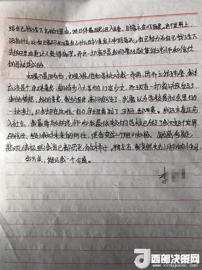 從北京看病回來(lái)后,他聯(lián)系之前溝通的幾位校長(zhǎng)均無(wú)人回應(yīng),無(wú)奈他又找到教育局,教育局才組織學(xué)校、教育局、當(dāng)事人的律師、還叫了他在慶陽(yáng)某縣城教書(shū)的兄長(zhǎng)一起開(kāi)了協(xié)調(diào)會(huì)。協(xié)調(diào)過(guò)程中,學(xué)校一直認(rèn)為他要求學(xué)校道歉是為了抬高賠償。殊不知,他只是想為孩子爭(zhēng)取一個(gè)公平的說(shuō)法,解開(kāi)孩子的心結(jié),配合醫(yī)生的治療。“孩子第一時(shí)間找學(xué)校就是想讓學(xué)校幫她排除學(xué)習(xí)的干擾,這種隱形的威脅。但是學(xué)校沒(méi)做到,她就想學(xué)校能給她個(gè)道歉也好,我當(dāng)時(shí)提出這個(gè)要求他們都不吭聲。我就求他們,你們覺(jué)得如果書(shū)面的道歉做不到,哪怕你們某一級(jí)領(lǐng)導(dǎo)代表學(xué)校跟孩子說(shuō)說(shuō),就全當(dāng)救我孩子呢!”李某奕父親講。但教育局和學(xué)校一直跟他講賠償?shù)氖拢瑳](méi)人答應(yīng)他的要求。“然后把我哥單獨(dú)叫出去,說(shuō)這個(gè)事不能任由你弟任性處理,今天開(kāi)這協(xié)調(diào)會(huì)你也明白,后來(lái)我哥就給我說(shuō),讓我先聽(tīng)人家怎么說(shuō),別反駁人家,我就再?zèng)]吱聲。”李某奕父親補(bǔ)充說(shuō)。