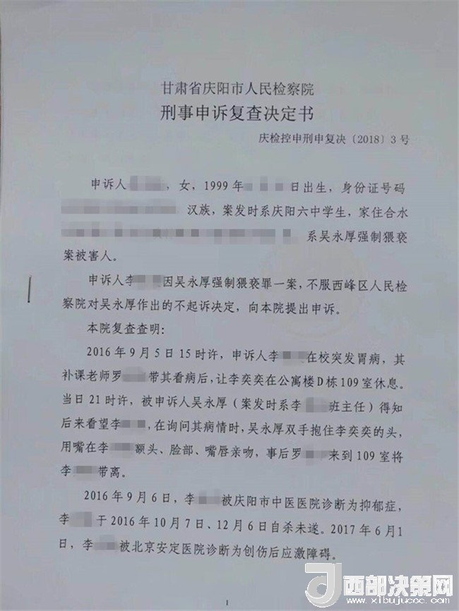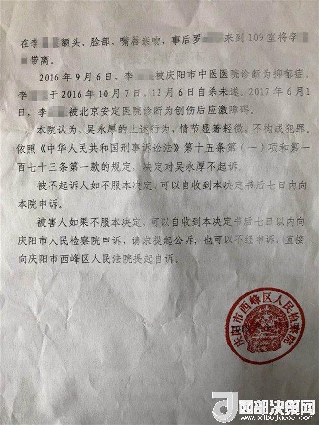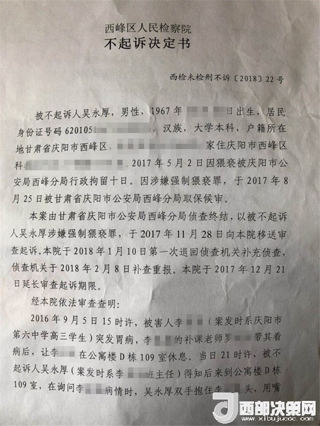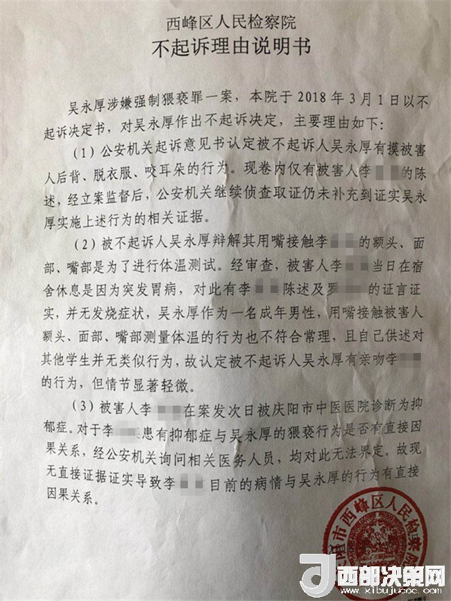 2017年2月26日,李某奕在父親陪同下到公安機(jī)關(guān)報(bào)案,稱被其班主任吳某厚猥褻,要求查處。經(jīng)辦案部門調(diào)查,2017年5月2日,公安機(jī)關(guān)依據(jù)《中華人民共和國(guó)治安管理處罰法》第四十四條之規(guī)定,以猥褻行為對(duì)吳某厚處以行政拘留十日處罰。其間,李某奕父親認(rèn)為公安局處罰不當(dāng),到西峰區(qū)人民檢察院進(jìn)行申訴。區(qū)檢察院調(diào)閱案卷后認(rèn)為吳某厚的行為涉嫌犯罪,書(shū)面通知公安局立案?jìng)刹?。公安局?017年8月10日立為刑事案件。8月25日對(duì)吳某厚采取取保候?qū)彺胧?1月20日偵查終結(jié)后移送起訴至區(qū)檢察院。區(qū)檢察院審查后認(rèn)為吳某厚的行為“情節(jié)顯著輕微,不構(gòu)成犯罪”,“決定對(duì)吳某厚不起訴”,并出具《不起訴理由說(shuō)明書(shū)》。提出不起訴的三個(gè)理由,包括“公安機(jī)關(guān)繼續(xù)偵查取證仍未補(bǔ)充到吳某厚實(shí)施上述行為的相關(guān)證據(jù)”、“吳某厚有親吻李某奕的行為,但情節(jié)顯著輕微”、“無(wú)直接證據(jù)證實(shí)導(dǎo)致李某奕目前的病情與吳某厚的行為有直接因果關(guān)系”,于2018年3月1日作出不起訴決定。李某奕遂到慶陽(yáng)市人民檢察院進(jìn)行申訴。5月18日,市檢察院維持區(qū)檢察院不起訴決定。6月25日晚,據(jù)李某奕父親講,他已將申訴材料寄至甘肅省人民檢察院。