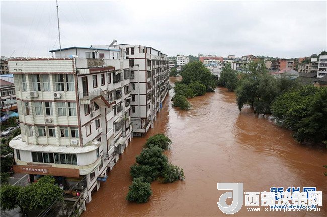 7月3日,四川省內(nèi)江市東興區(qū)田家鎮(zhèn)的小青龍河水位上漲,河邊部分民房被淹。 新華社發(fā)(蘭自濤 攝)