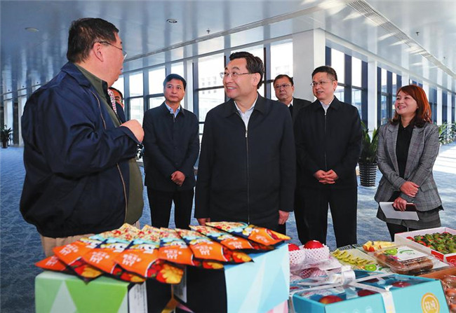 10月31日,省委書記胡和平深入西安市部分民營企業(yè)調研。圖為他在海升集團果業(yè)總部聽取產品種類、產業(yè)扶貧等情況介紹。 記者 宋紅梅攝