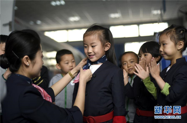 當(dāng)日,蘭州惠智博仁幼兒園的小朋友在東航甘肅分公司空乘人員的陪伴下來到蘭州文理學(xué)院,體驗客艙安全檢查、服務(wù)禮儀示范等內(nèi)容,迎接即將到來的“六一”兒童節(jié)。新華社記者 王朋 攝