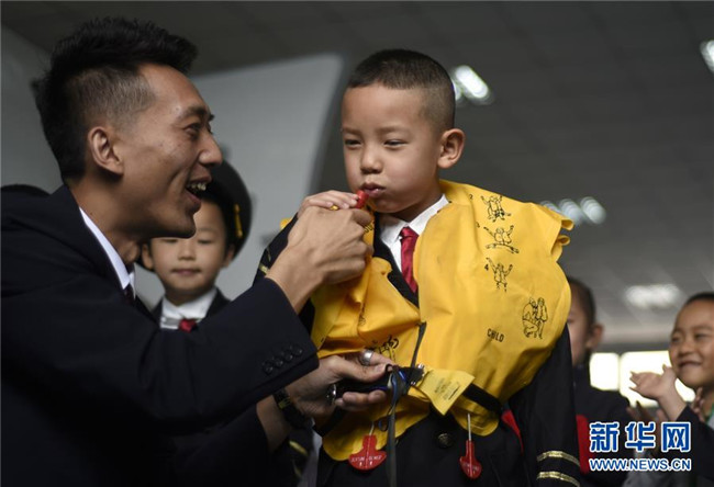 5月27日,在蘭州文理學(xué)院航空模擬訓(xùn)練艙,空乘人員引導(dǎo)小朋友體驗救生衣使用方法。