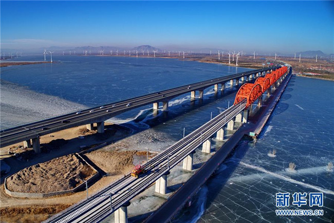 中鐵三局的工人在京張高鐵官?gòu)d水庫(kù)特大橋進(jìn)行鋪軌作業(yè)(2019年1月13日無(wú)人機(jī)拍攝)。新華社記者 楊世堯 攝