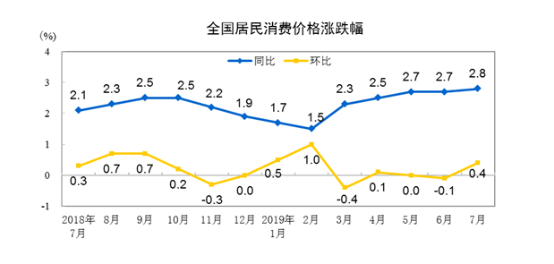記者從國家統(tǒng)計局獲悉,2019年7月份,全國居民消費價格同比上漲2.8%。其中,城市上漲2.7%,農(nóng)村上漲2.9%;食品價格上漲9.1%,非食品價格上漲1.3%;消費品價格上漲3.4%,服務價格上漲1.8%。1??—7月平均,全國居民消費價格比去年同期上漲2.3%。
