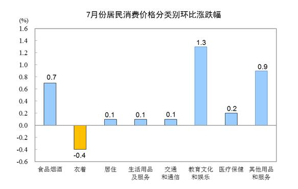7月份,全國居民消費價格環(huán)比上漲0.4%。其中,城市上漲0.4%,農(nóng)村上漲0.3%;食品價格上漲0.9%,非食品價格上漲0.3%;消費品價格上漲0.2%,服務價格上漲0.7%。