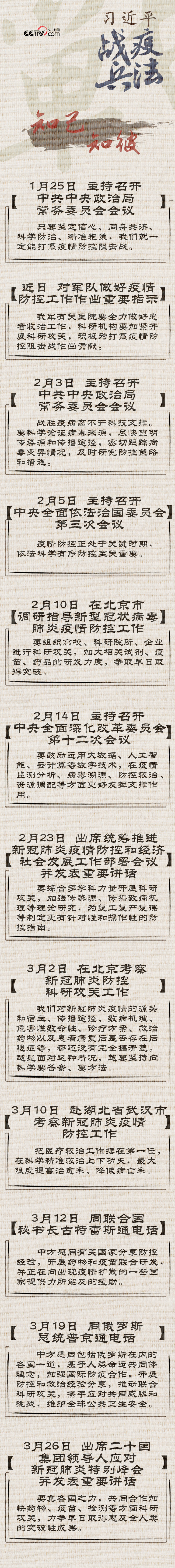 習(xí)近平從疫情防控之初就將科學(xué)防控放在了重要位置,從“堅定信心、同舟共濟、科學(xué)防治、精準施策”的總要求,到“加大科研攻關(guān)力度”的反復(fù)叮囑,再到“搞清楚病源從哪里來、向哪里去”的關(guān)切,科學(xué)防控始終是習(xí)近平戰(zhàn)“疫”部署的一條鮮明主線。
