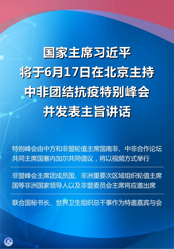 特別峰會由中方和非盟輪值主席國南非、中非合作論壇共同主席國塞內(nèi)加爾共同倡議,將以視頻方式舉行。非盟峰會主席團(tuán)成員國、非洲重要次區(qū)域組織輪值主席國等非洲國家領(lǐng)導(dǎo)人以及非盟委員會主席將應(yīng)邀出席。聯(lián)合國秘書長、世界衛(wèi)生組織總干事作為特邀嘉賓與會。