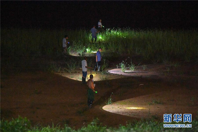 7月11日,位于湖南省岳陽市君山區(qū)的洞庭湖大堤上,工作人員和群眾在夜晚巡堤查險(xiǎn)。 新華社記者 陳澤國 攝