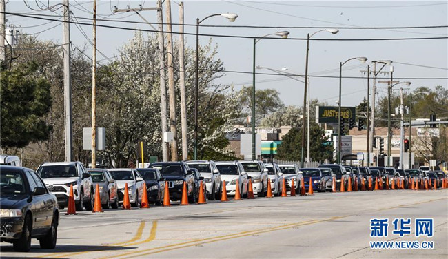 5月6日,在美國(guó)伊利諾伊州芝加哥西北部一處新冠病毒檢測(cè)點(diǎn),人們駕車排起長(zhǎng)隊(duì)等待檢測(cè)。 新華社發(fā)(喬爾·萊納攝)