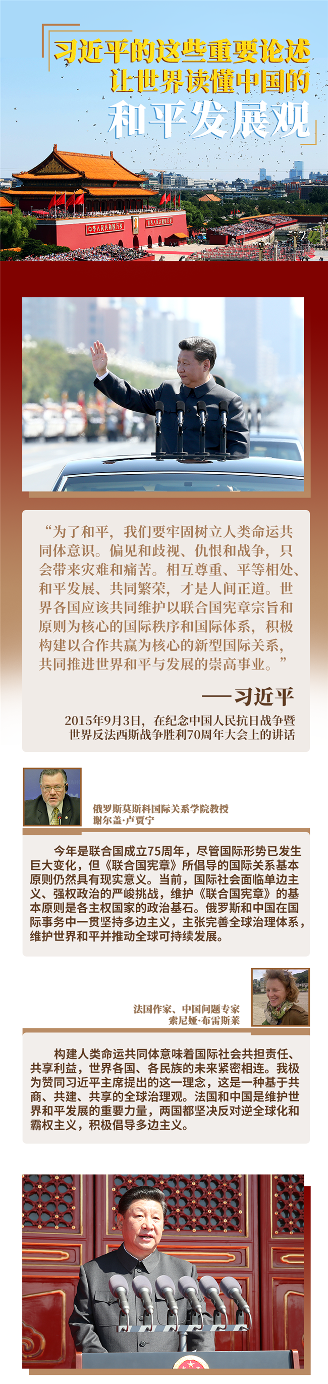 當(dāng)今世界仍不太平,新冠疫情推動(dòng)百年變局加速變化,進(jìn)入動(dòng)蕩變革期的世界亟需明確前行方向。此時(shí),重溫5年前習(xí)近平主席紀(jì)念中國(guó)人民抗日戰(zhàn)爭(zhēng)暨世界反法西斯戰(zhàn)爭(zhēng)勝利70周年重要講話中關(guān)于和平發(fā)展的重要論述,尤其具有現(xiàn)實(shí)意義——