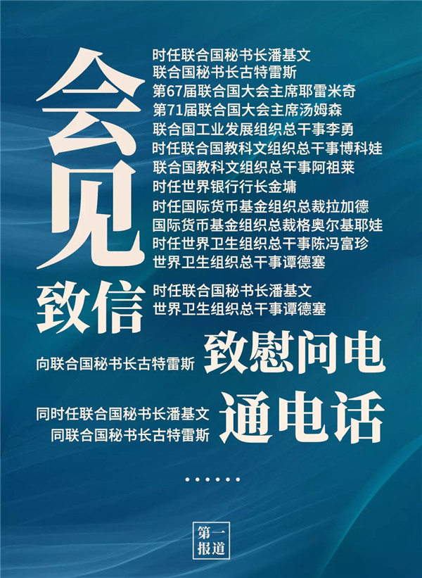 2013年以來,習主席通過會見、通話、致信函等多種方式同聯(lián)合國主要官員保持密切溝通?;訉ο蟀?lián)合國秘書長、聯(lián)合國大會主席,還有聯(lián)合國工業(yè)發(fā)展組織、聯(lián)合國教科文組織、世界銀行、國際貨幣基金組織、世界衛(wèi)生組織等聯(lián)合國專門機構主要負責人。