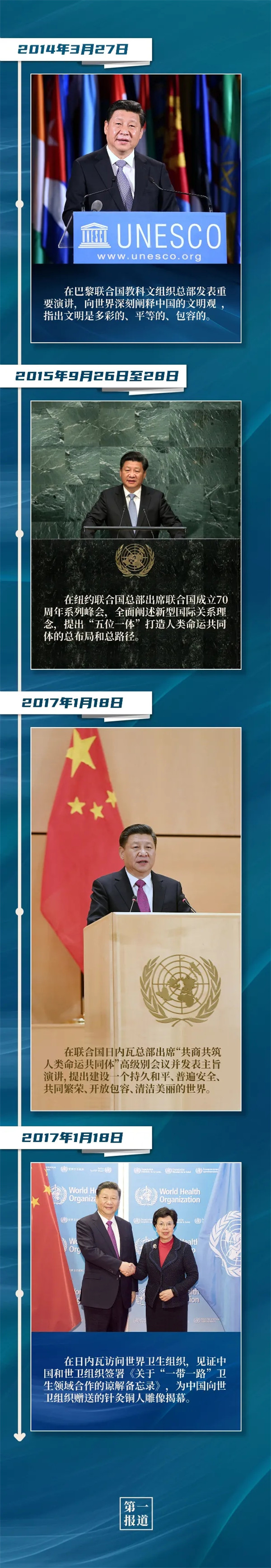習主席指出,“支持聯(lián)合國發(fā)揮作用,維護聯(lián)合國權威和地位,是中國外交一項基本政策。”2013年以來,習主席多次會見聯(lián)合國主要官員,訪問聯(lián)合國總部及聯(lián)合國專門機構,出席一系列聯(lián)合國活動……親自推動中國同聯(lián)合國的合作,發(fā)出支持聯(lián)合國事業(yè)、捍衛(wèi)多邊主義的中國強音。