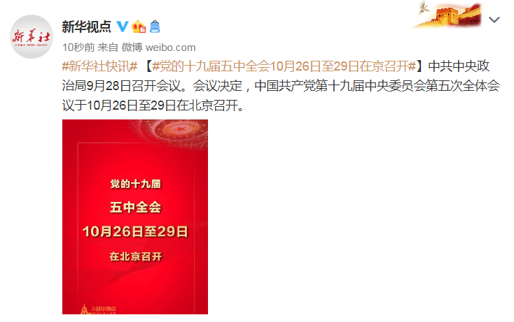 黨的十九屆五中全會(huì)10月26日至29日在京召開