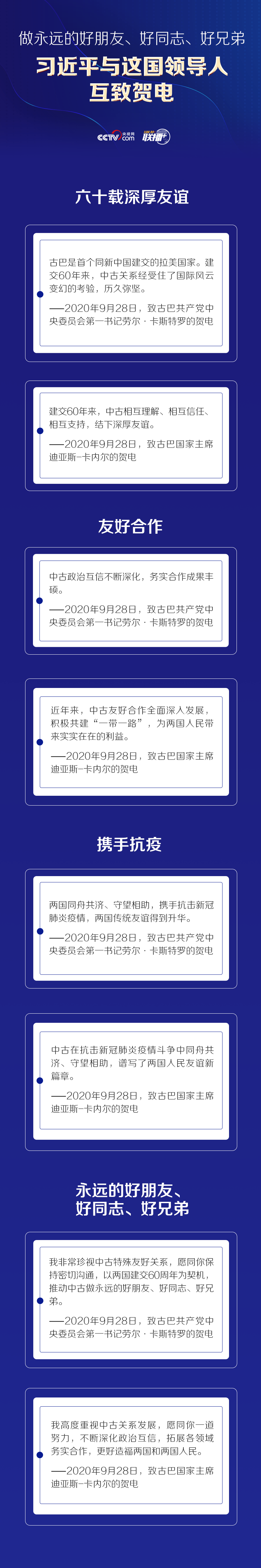 9月28日,中共中央總書記、國家主席習(xí)近平分別同古巴共產(chǎn)黨中央委員會(huì)第一書記勞爾·卡斯特羅、古巴國家主席迪亞斯-卡內(nèi)爾互致賀電,熱烈慶祝兩國建交60周年。