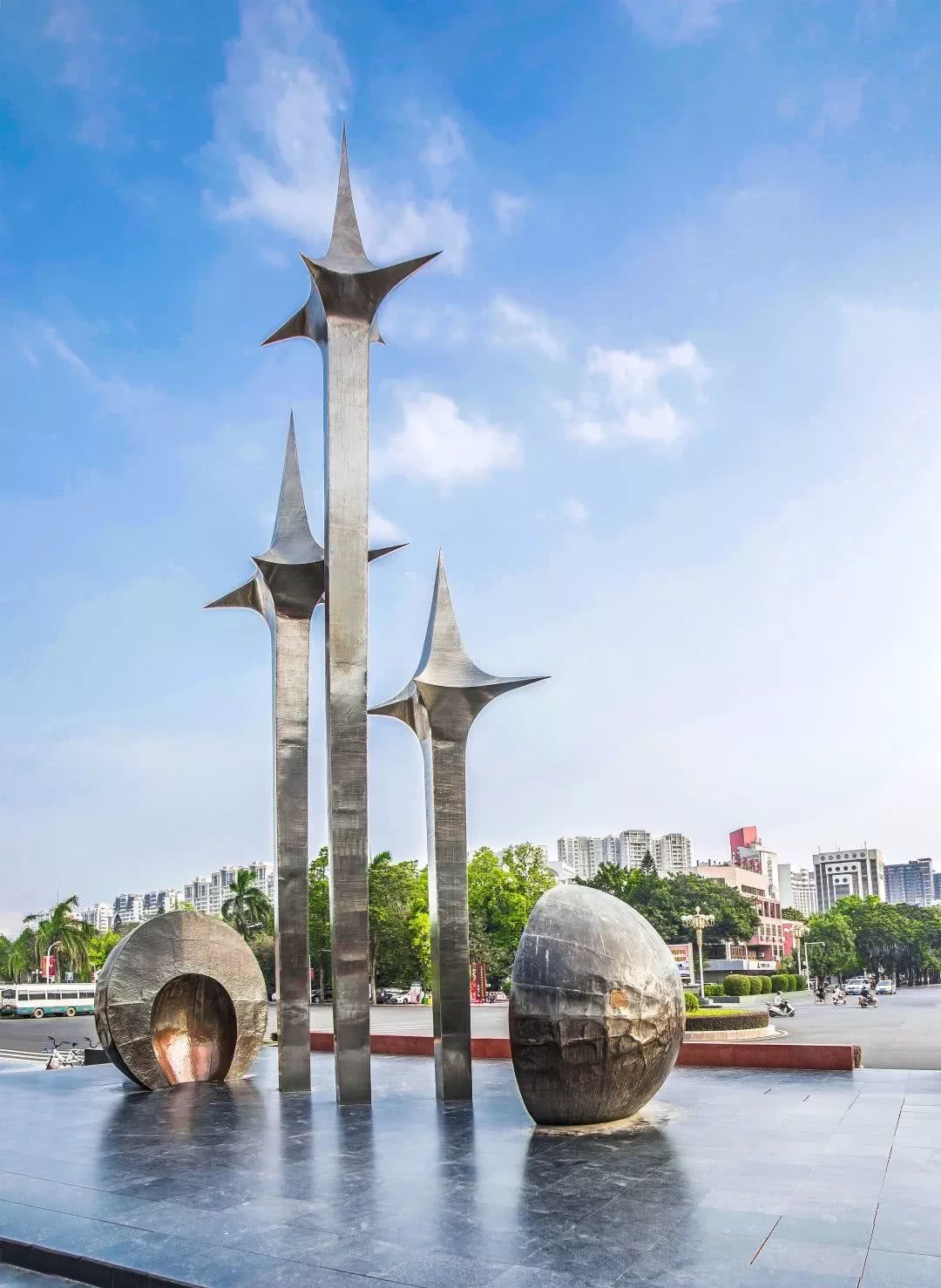 △汕頭的標志性雕塑《升騰》,三根頂部鑲有星星標志的金屬桿錯落有致,高聳挺拔,寓意汕頭發(fā)展日日上升。(資料圖)