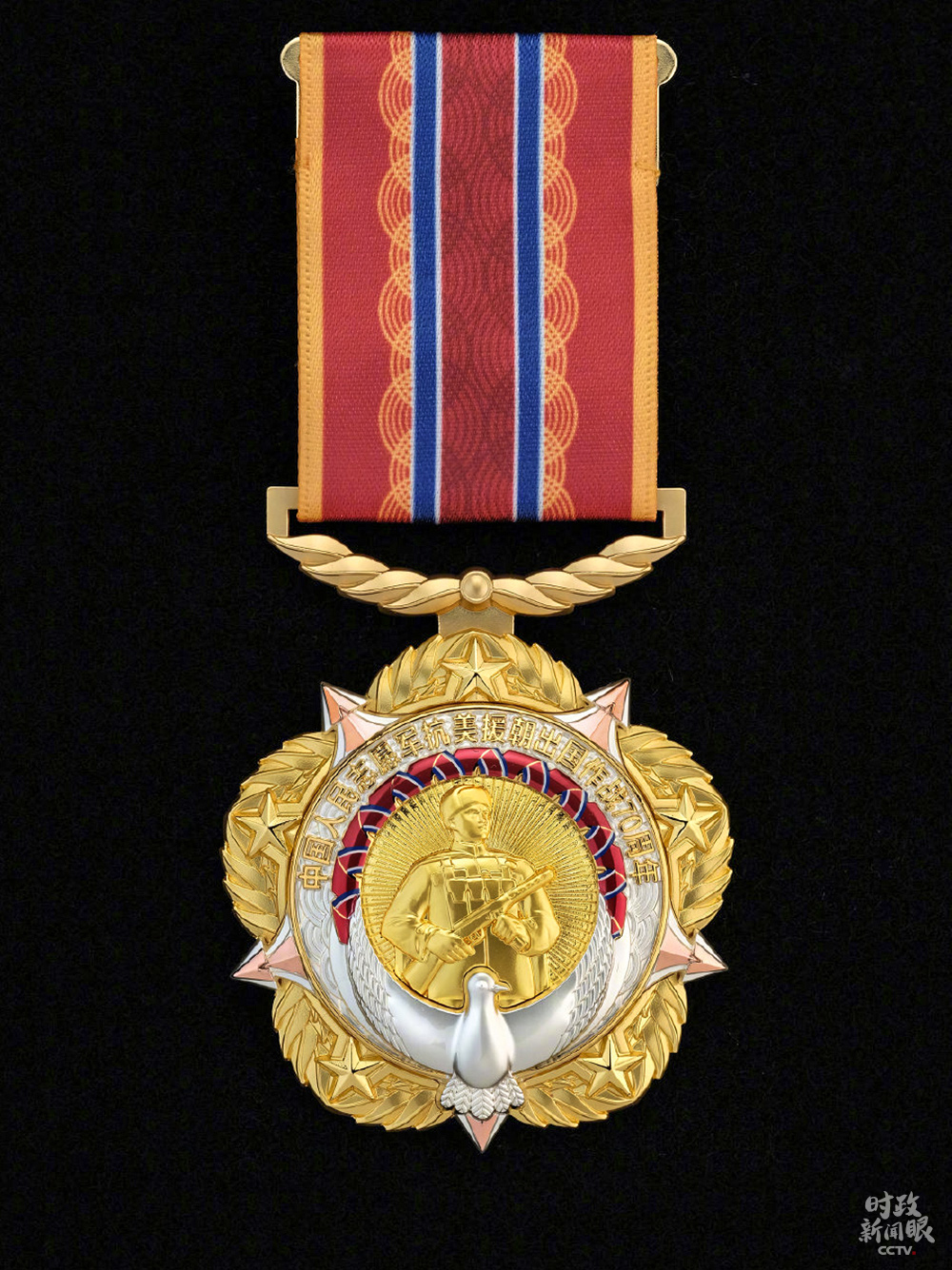 △紀(jì)念章核心部分為志愿軍戰(zhàn)士形象和70束光芒,以和平鴿、水紋和中朝兩國國旗元素編制的綬帶環(huán)繞四周。