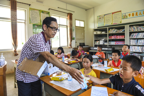 在廣西武宣縣二塘鎮(zhèn)雙桂小學(xué),老師韋旭禧給學(xué)生們發(fā)牛奶(6月19日攝)。新華社記者 曹祎銘 攝