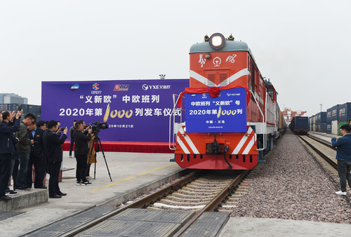 10月21日,2020年第1000列“義新歐”中歐班列從鐵路義烏西站發(fā)車。新華社發(fā)(龔獻(xiàn)明 攝)