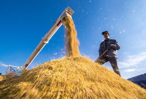 在吉林省吉林市一拉溪鎮(zhèn),農(nóng)民在運糧車上整理收割機(jī)收獲的水稻(2018年9月17日攝)。新華社記者 許暢 攝