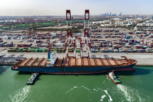 10月27日,一艘貨輪??刻旖蚋?。天津港集團(tuán)正式開通運營今年第四條“一帶一路”新航線(無人機(jī)照片)。新華社發(fā)