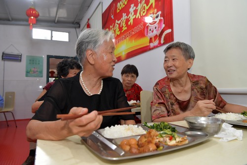 在江西省南昌市東湖區(qū)彭家橋街道文教路北社區(qū),老人們在社區(qū)的“幸福食堂”吃午飯(7月29日攝)。新華社記者 彭昭之 攝