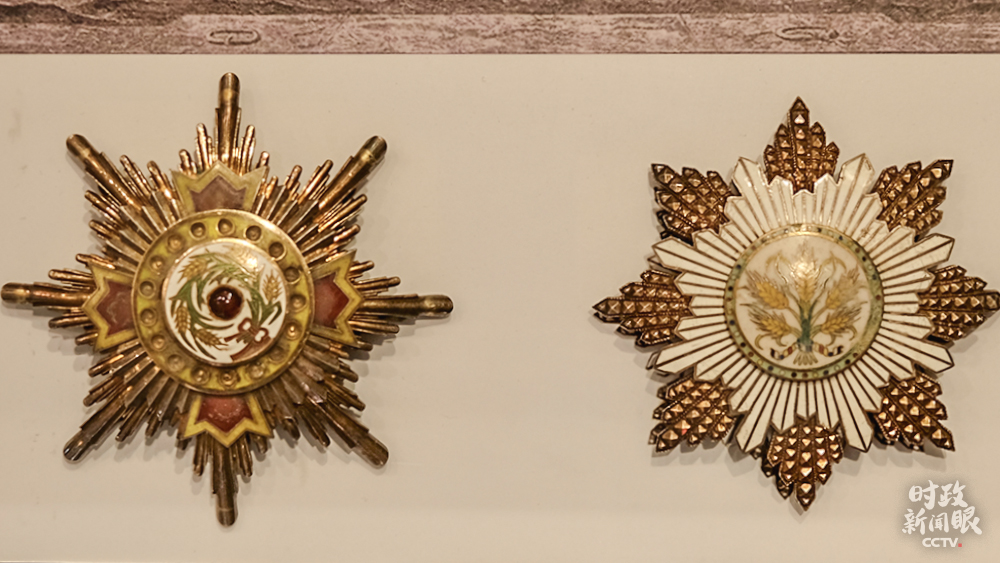 △這是民國政府頒授給張謇的寶光嘉禾勛章(左)和嘉禾勛章(右),以表彰他在實(shí)業(yè)、教育等方面的救國主張和實(shí)踐。(總臺央視記者彭漢明拍攝)