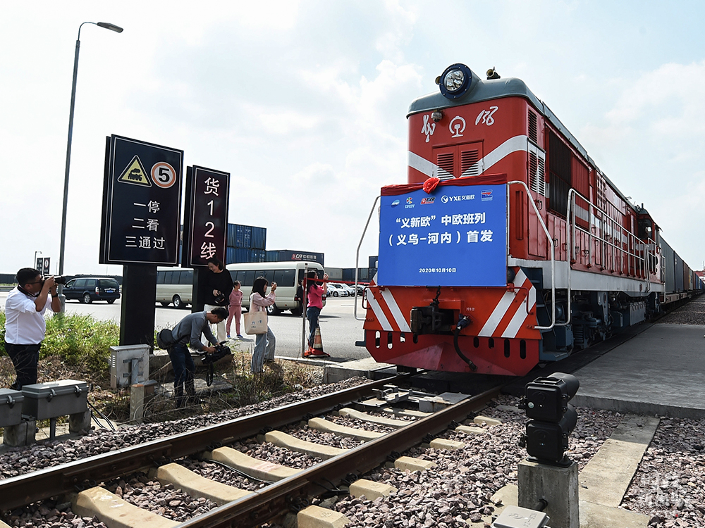 △今年10月10日,“義新歐”中歐班列(義烏—河內(nèi))從義烏西站首發(fā)啟程,最終將抵達(dá)越南河內(nèi)站。這是該班列首次開通面向東南亞國(guó)家和地區(qū)的南向通道。