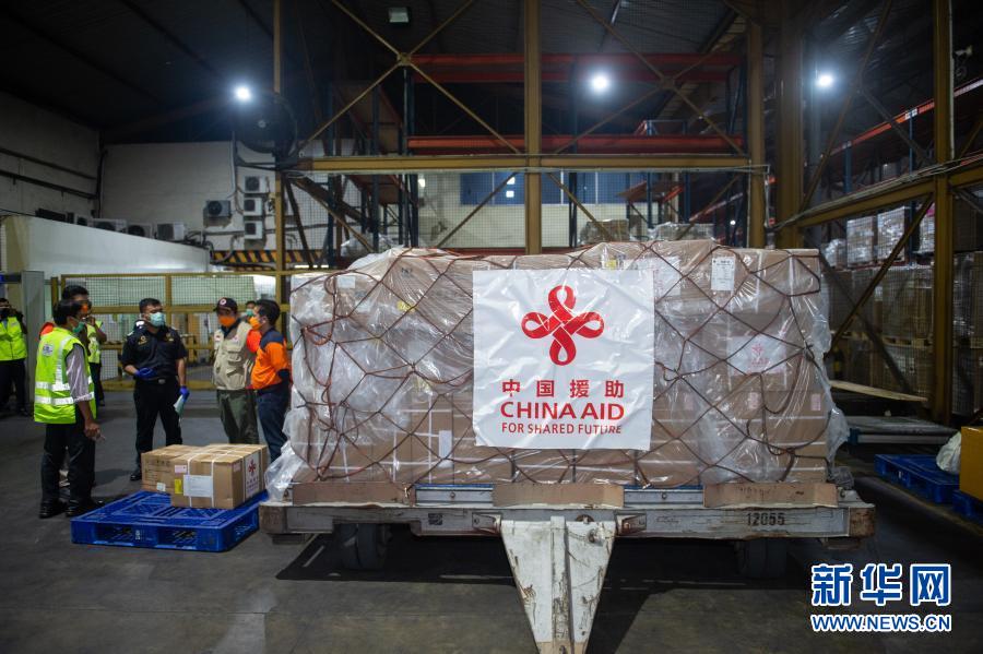 3月26日,中國援助印度尼西亞的首批抗疫物資停放在雅加達(dá)蘇加諾哈達(dá)機(jī)場(chǎng)倉庫。新華社記者 杜宇 攝