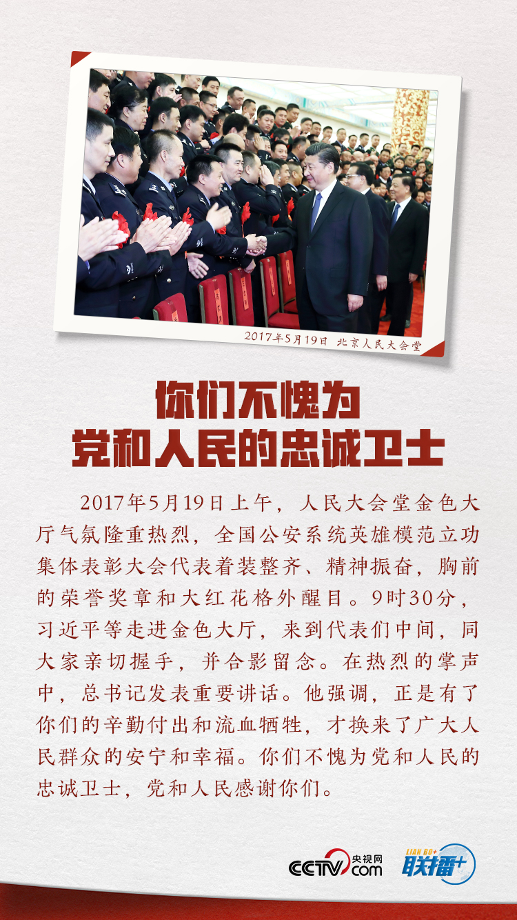 一直以來,習(xí)近平總書記對政法工作、對人民警察隊伍高度重視。黨的十八大以來,總書記多次會見全國公安系統(tǒng)的英模代表,多次到基層看望慰問人民警察,在不同場合多次表達(dá)對這支隊伍的關(guān)心關(guān)愛。央視網(wǎng)《聯(lián)播+》欄目特選取六幅珍貴畫面,結(jié)合總書記相關(guān)重要講話,為您展示人民領(lǐng)袖對人民警察的深情厚望。