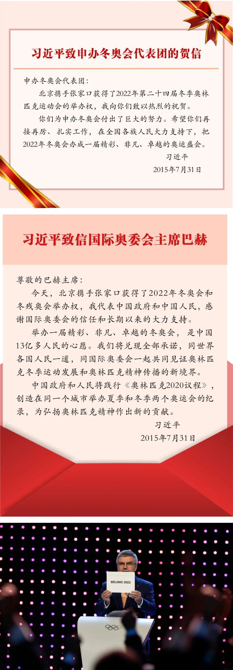 ↑2015年7月31日,在馬來西亞吉隆坡舉行的國際奧委會第128次全會上,北京攜手張家口獲得2022年冬奧會舉辦權(quán)。這是國際奧委會主席巴赫宣布結(jié)果。新華社記者 公磊 攝