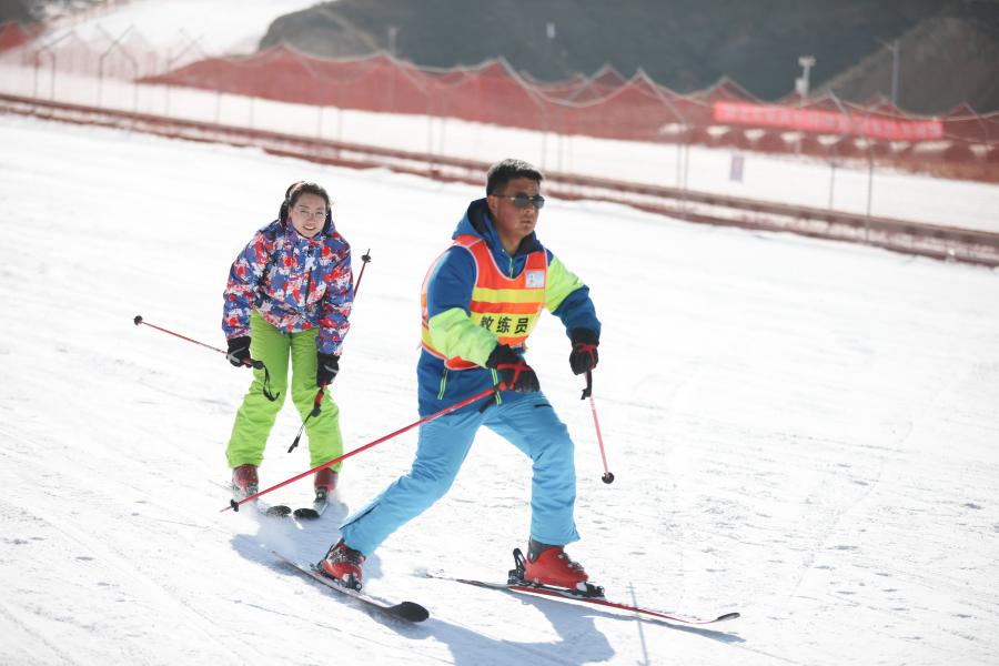 ▲ 1月8日,在甘肅白銀國家雪上項目訓練基地,一名教練指導滑雪愛好者滑雪。新華社記者 馬希平 攝