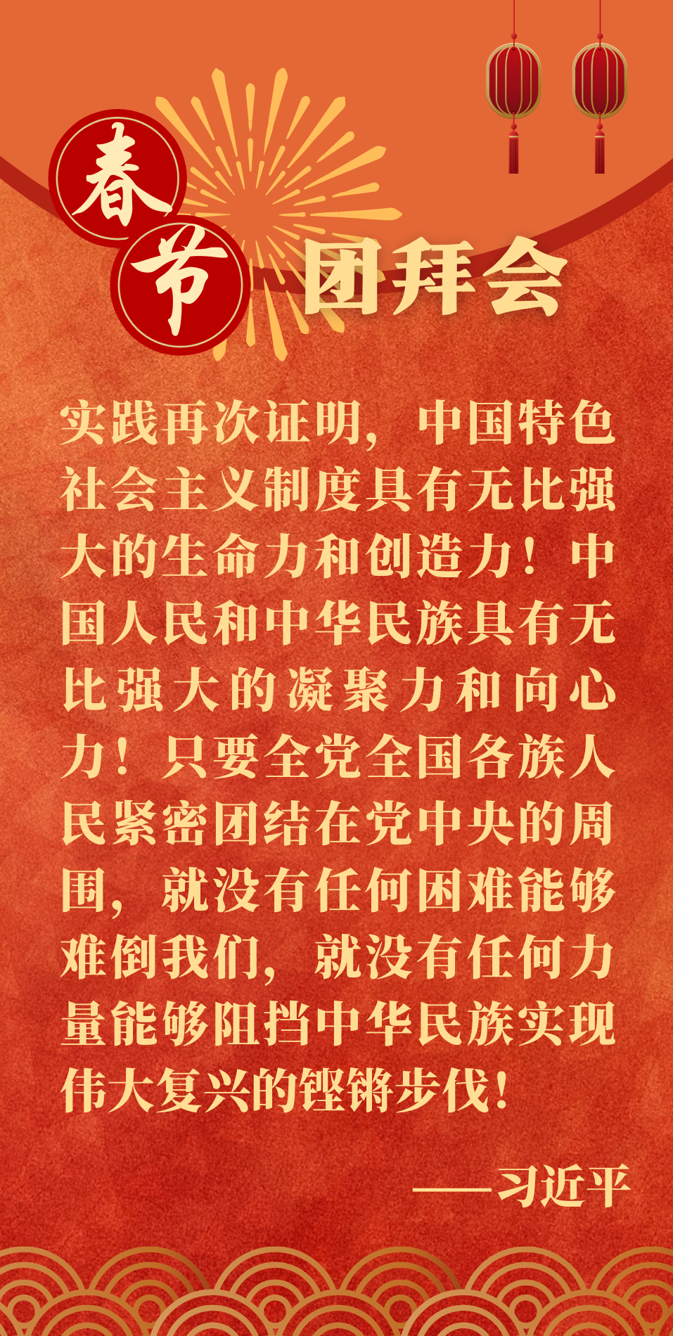 2月10日上午,中共中央、國(guó)務(wù)院在人民大會(huì)堂舉行2021年春節(jié)團(tuán)拜會(huì)。中共中央總書(shū)記、國(guó)家主席、中央軍委主席習(xí)近平發(fā)表講話,代表黨中央、國(guó)務(wù)院,向全國(guó)各族人民,向香港特別行政區(qū)同胞、澳門(mén)特別行政區(qū)同胞、臺(tái)灣同胞和海外僑胞拜年。