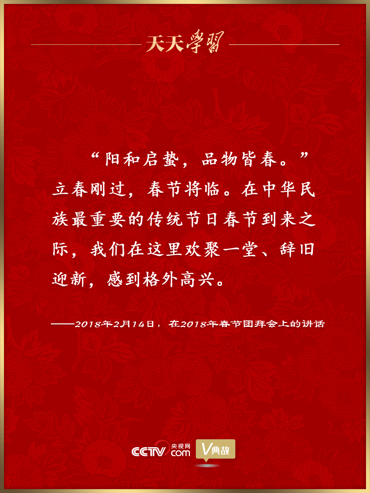 黨的十八大以來,習(xí)近平總書記多次在臘月二十九舉行的春節(jié)團(tuán)拜會(huì)上發(fā)表重要講話,盤點(diǎn)舊歲、謀劃新年,向全國各族人民、港澳臺(tái)同胞和海外僑胞拜年,并致以美好的新春祝福。在講話中,習(xí)近平總書記頻頻引用具有新春節(jié)令特點(diǎn)的古代經(jīng)典詩文名句抒發(fā)情懷、暢想未來。這些詩文名句如春風(fēng)化雨潤人心田、暖人心扉,激勵(lì)著億萬人民在新的一年里追夢前行。
