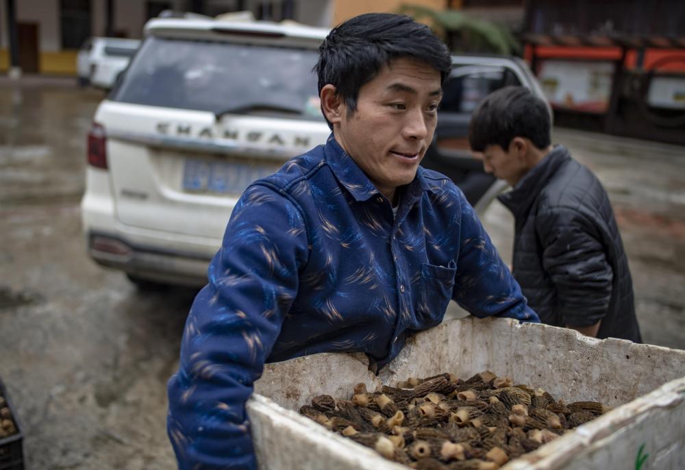 云南貢山縣獨(dú)龍江鄉(xiāng)龍?jiān)?ldquo;致富能手”和曉永在鄉(xiāng)里賣(mài)羊肚菌(2019年4月19日攝)。 新華社記者 江文耀 攝