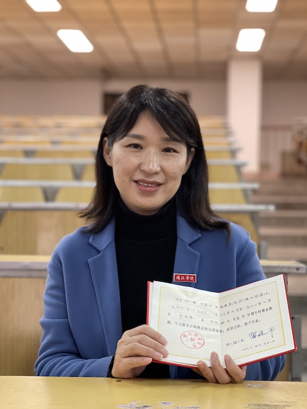 △這是閩江職業(yè)大學中文秘書專業(yè)1992屆學生任濤,她手里拿的是習近平當時簽發(fā)的畢業(yè)證書。(總臺央視記者盧心雨拍攝)