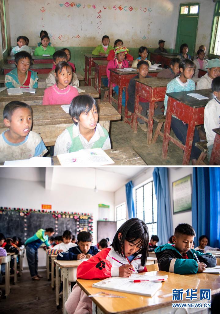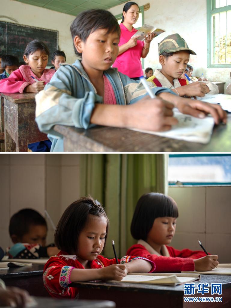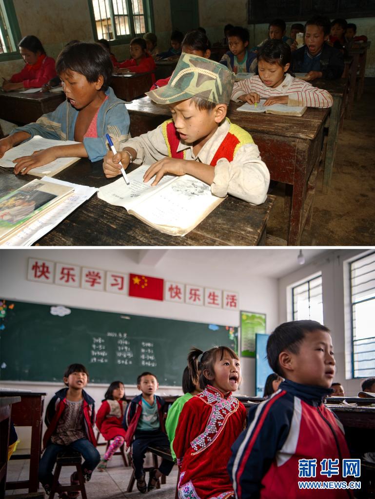 這張拼版照片的上圖:2003年12月6日,云南省瀾滄拉祜族自治縣富邦鄉(xiāng)半山小學的孩子們在上課(新華社記者 李銀 攝);下圖:2021年3月2日,云南省瀾滄拉祜族自治縣富邦鄉(xiāng)半山小學已撤并到富邦鄉(xiāng)中心完小,這是孩子們在教室里上課(新華社記者 江文耀 攝)。新華社發(fā)