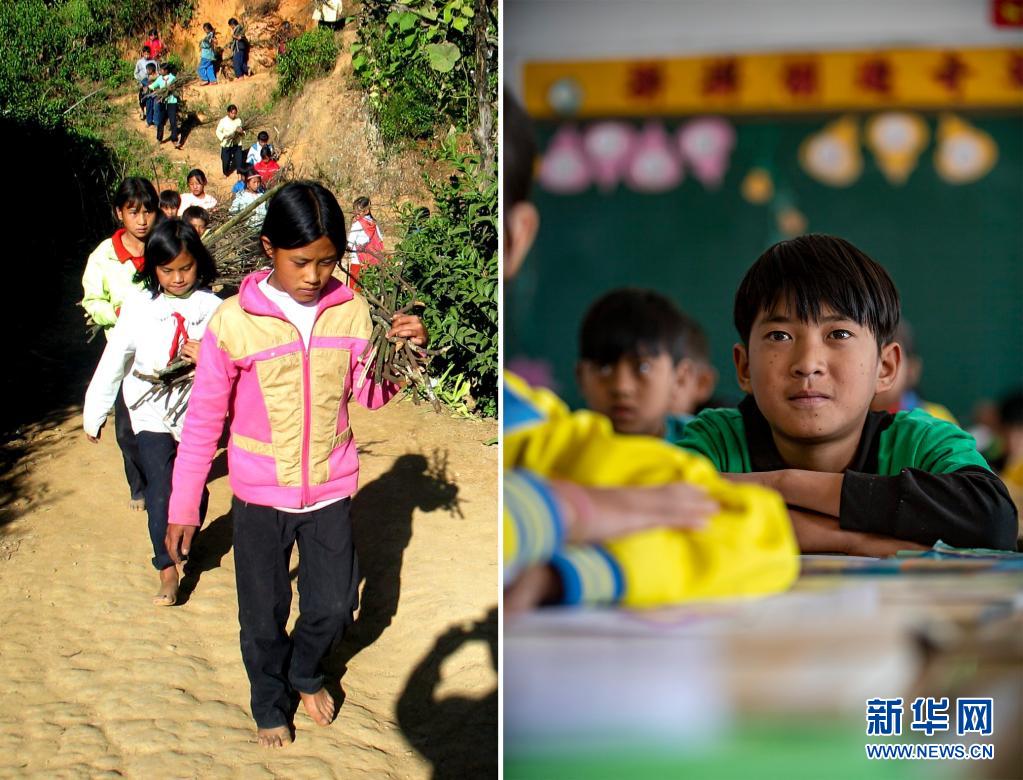 這張拼版照片的左圖:2003年12月6日,云南省瀾滄拉祜族自治縣富邦鄉(xiāng)半山村小學的學生李娜兒(前)在拾柴(新華社記者 李銀 攝);右圖:2021年3月2日,李娜兒的兒子在富邦鄉(xiāng)中心完小五年級的課堂上(新華社記者 江文耀 攝)。新華社發(fā)